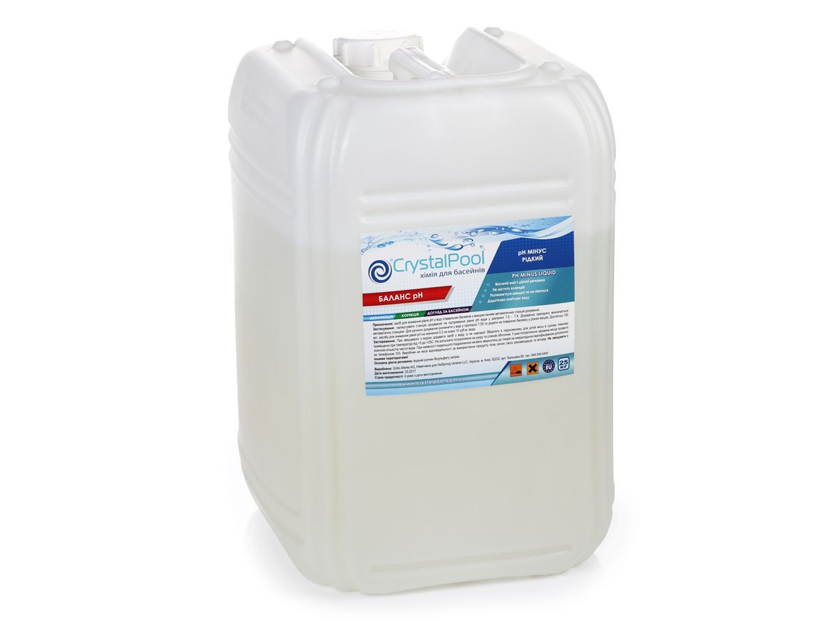 СПОСОБ ПРИМЕНЕНИЯ:Препарат дозируется в воду бассейна с помощью дозирующего автоматического устройства. Для поддержания оптимального уровня рН воды бассейна 7,2-7,6 необходимо 2-3 раза в неделю проводить контрольные замеры тестером. Значение рН выше 7,6 должно быть снижено до 7,2 добавлением средства «Регулятор рН – минус». При отсутствии дозирующего автоматического устройства рекомендуется проводить ручное дозирование. Рекомендуемая дозировка (при ручной дозации): для снижения значения рН на 0,1 добавить 100 мл средства на 10 м3 воды. Жесткая вода, а также интенсивное использование бассейна требуют больших и более частых добавок. Дозировки средства в зависимости от объема бассейна указаны на упаковке.